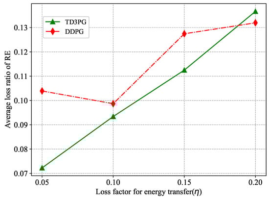 In order to evaluate the performance of the proposed algorithm in reducing the carbon emissions of the network, Figure 12 shows the average loss ratio of RE for different loss factors of energy transmission. The smaller the average loss rate of RE, the more carbon emissions are reduced. As the two algorithms can intelligently optimize the sharing proportion () of RE, the proposed algorithm shows better performance compared to the DDPG algorithm. It is worth noting that the average loss ratio of RE under the DDPG algorithm at is higher than that . It may be that too much energy is carried over when too little energy is shared. When RE arrives in the next time slot, the total remaining energy exceeds the backup battery capacity, which leads to an increase in the amount of RE () that is discarded.