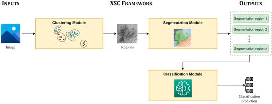 Initially, the input image is imported (Step 1) and a number of pre-processing steps are applied such as resizing, normalization, etc. (Step 2). In Step 3, the clustering module is applied for clustering the image into sub-regions. In Step 4, these sub-regions are exploited by the segmentation module to calculate the “segmentation regions,” which constitutes the XSC’s prediction regarding the segmentation task. Finally, in Step 5, the classification module is applied for classifying the image to a specific category.
