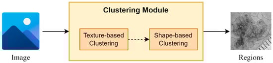 The proposed clustering module is based on a two-stage clustering approach composed of texture-based and a shape-based clustering components (Figure 2). More specifically, for every input image, the texture-based component applies a clustering algorithm, which clusters the image in regions based on its texture information (intensity pixels’ values). Next, the shape-based component for every input region applies a second clustering algorithm, which further splits every region into sub-regions based on their shape information (pixels’ coordinates values). It is worth mentioning that the output of this module is a set of sub-regions, which compose the input image.