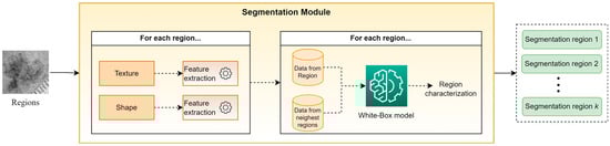 Figure 3 presents an abstract overview of the proposed segmentation module’s workflow. This module takes as input the output of the clustering module, i.e., a set of sub-regions. For every identified sub-region, a trained white box (WB) model is applied in order to classify it in one of the segmentation classes. To perform this task, the WB takes into account hand-crafted features, which are based on descriptive statistics (mean, st.d., median, kurtosis, skewness, etc.) from both the texture and shape of each sub-region, as well as from the sub-regions with the closest centroids. The motivation for this approach is based on the desire to exploit information not only from the current sub-region but also from its neighboring sub-regions. Finally, all sub-regions assigned to the same segmentation class are concatenated, composing the “segmentation regions,” which constitute the outputs of XSC framework relative to the segmentation problem. Note that in our experiments, the selected descriptive statistics were the mean values and the st.d., while parameter was set to 5.