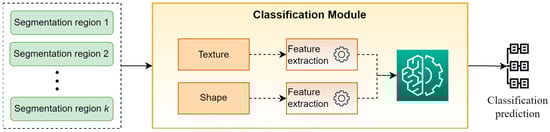 Figure 4 presents a high-level overview of the classification module. This module takes as input the “segmentation regions” developed by the segmentation module and classifies the original image into a specific category. For performing this task, a set of hand-crafted features based on the descriptive statistics of texture and shape of “segmentation regions” are calculated and are used as input to a WB predictor for providing the final classification prediction. It is worth mentioning that in our experiments, the selected descriptive statistics were the mean values and the st.d., while XGBoost was selected as WB classifier.