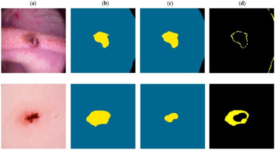Visual comparison for the XSC segmentation model for malignant (first-row images) and a benign (second row images) examples. (a) Initial. (b) Ground-truth. (c) Predicted. (d) Difference.