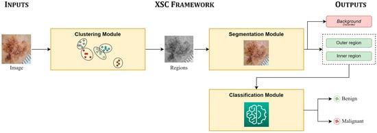 In this research, we propose a new explainable framework, named XSC, designed for segmentation and classification tasks in image processing. The framework mainly emphasizes transparency and interpretability, and it is composed of three modules: clustering, segmentation, and classification. The clustering and segmentation modules collaborate to partition the input image into regions of interest, while the classification module exploits the information provided by the previous modules and conducts a prediction utilizing an explainable classifier and hand-crafted features. The XSC framework’s effectiveness was assessed in a skin-cancer case study, demonstrating promising results and comparable performance to the presented state-of-the-art DL models, while maintaining interpretability and explainability.