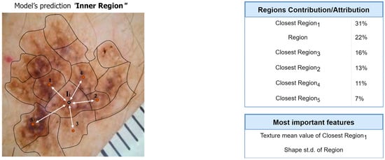 Regarding the segmentation prediction of the XSC framework, it was found that the WB (XGBoost) model in the segmentation module mainly decides based on the texture features of its five nearest regions rather than the features from the region. In addition, this model mainly decides based on the mean texture value of its closest region1 and the shape st.d of its region. Regarding the classification prediction of the proposed framework, it is shown that the WB (XGBoost) model in the classification module mainly decides based on both the texture’s st.d and shape’s st.d features of the inner region.