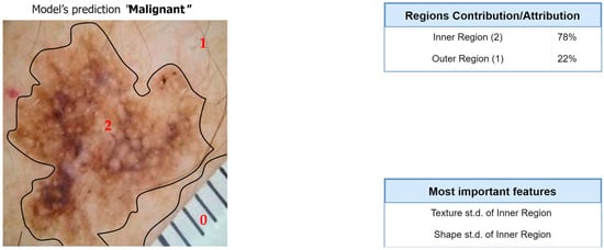 Finally, during the application of the classification module, a set of features based on descriptive statistics from both the outer and the inner region was calculated. These features were fed to a white box (XGBoost) model to provide its predictions for the original image (“benign” or “malignant”). It is worth mentioning that the “background” region had no useful information to provide to the classifier; thus, it was discarded during the classification process.