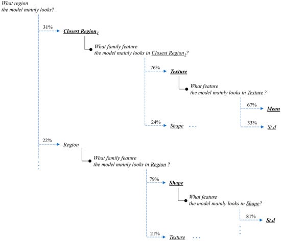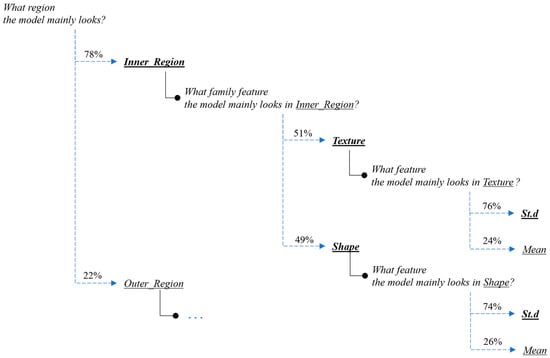 Furthermore, in order to create a transparent and interpretable prediction model, we adopted the feature-hierarchy-based-tree philosophy [15] in our segmentation module (Figure 4). This means that our topology is constituted by first-order features, second-order features, and third-order features to explain the segmentation predictions of every input image’s region. The regions constitute the first-order features, while for every region, various feature families (second-order features) are extracted such as “texture features”, and “shape features”. In addition, every feature family is constituted by various specific feature-extraction formulas (third order features) corresponding to its feature-family category. In our case, these formulas are the descriptive statistics described previously. Finally, all the extracted features are fed into a white-box predictor and the explanation of every prediction is interpreted by computing the attributions for every tree branch of the feature-hierarchy tree in a backward way [15].