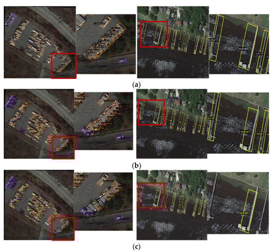 In order to obtain a more intuitive comparison effect, we visualized the detection results. Figure 9 and Figure 10 are comparisons of the detection results of our method with the baseline, R-RetinaNet, and R-F-R on the DOTA dataset and HRCS2016 dataset, respectively, where (a) represents the real label map, (b) represents the detection result of our method, and (c) represents the baseline detection result. It can be seen that our method reduces false detection and missed detection compared with the other methods, and has better performance in the detection of densely arranged targets.