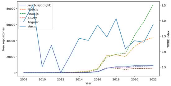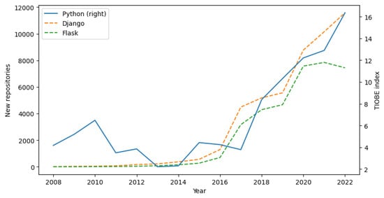 - The number of newly created repositories in GitHub could be used to forecast the TIOBE Index of the language that a given framework is addressing for six frameworks: Node.js, jQuery, Angular, Django, Flask, and Ruby on Rails;