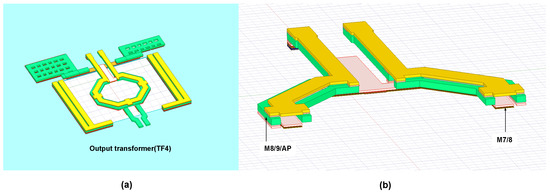 Assuming is 19 fF (could be changed in a later design stage if needed), then the total left capacitance is calculated to be 114.69 fF. An initial assumption of of 19 fF is based on the fact that there is usually parasitic capacitance of the transformer [16], and extra added capacitor can be used as an additional degree of freedom to facilitate the design of MCR. should be as small as possible because a larger (leading to a larger ) results in decreased GBW of the MCR [16]. According to Equations (6) and (7), Q = 1.0116, and k = 0.703 are obtained. According to Equations (8)–(10), we obtain that = = 303.26 pH, = = 114.69 fF, and = 25.69 fF at 32 GHz, respectively. Some iterations of the calculation and design tuning of the values of Q, k, , , and are necessary to make these parameters satisfy the no in-band ripple condition equations. Figure 4 presents (a) the 3D view of the output transformer (TF4 in Figure 1) in the symmetrical MCR and (b) its layer structure. To achieve a coupling factor k as high as 0.7, a combination of interleaved and stacked structures is employed [24,25,26], as shown in Figure 4b. The primary inductor of the stacked part is metal 8 paralleled with metal 7. The secondary inductor consists of metals 8 and 9 and the AP layer in parallel. These paralleled metals increase the Q factor of the windings. Also with a high k factor, according to Formula (11), the insertion loss of the transformer is decreased, in which , , , and k represent the passive efficiency, the Q factor of primary/secondary windings, and the coupling coefficient of the two windings, respectively [5]. The distance between AP layer and metal 8 is as far as 4.94 m, so the parasitic capacitance between and is not high enough to affect the SRF of the output transformer seriously. Figure 5a,b show the finally realized inductance and Q factor of and . Figure 6a shows the k between and , and Figure 6b shows the 3D view of the whole output matching network, respectively.