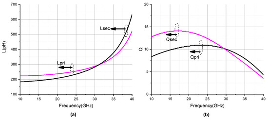 The (a) inductance and (b) Q factor of and for the output transformer (TF4) in MCR4.