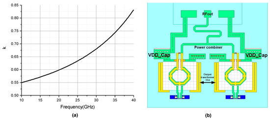 K is the coupling coefficient between the two inductors, as shown in Figure 2. In this work, the interest frequency band is from 26 GHz to 36 GHz. As the output power and power gain at low frequency is larger than that at high frequency, we choose 32 GHz rather than 31 GHz as the center operation frequency to calculate the parameters of the output-matching MCR. Based on the loadpull simulation, we choose = (26 + j*26) for the power stage at 32 GHz. The conjugate of Zopt is = (26 − j*26) , which is equivalent to a resistor of = 52 parallel with a capacitor of = 95.65 fF, as shown in the lumped model of the output symmetrical MCR in Figure 3. The symmetrical MCR transfers the input impedance of the power combiner to for the power stage. The power combiner at the output, as shown in the dashed line on the top of Figure 1a, is designed to reactively transfer the load impedance to = (27.86 − j*25.96) for the output transformer by using microstrip transmission-line segments. In the output symmetrical MCR shown in Figure 3, , . represents the extra added capacitor on the primary side if needed. represents the equivalent paralleled output capacitance of the power combiner input impedance (), which is 89 fF in this work. represents the extra added capacitor on the right side if needed. represents the equivalent paralleled output resistor of the power combiner input impedance (), which is also 52 in this work. For a symmetrical MCR, the coupling factor k and Q factor satisfy the equations below under the no in-band ripple condition [16]: