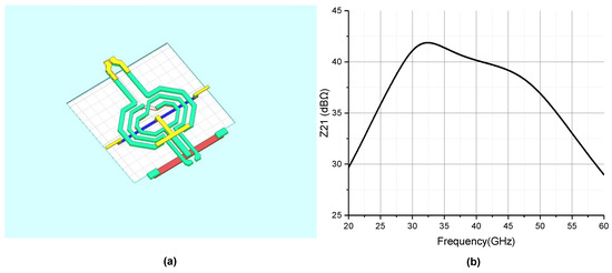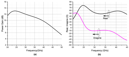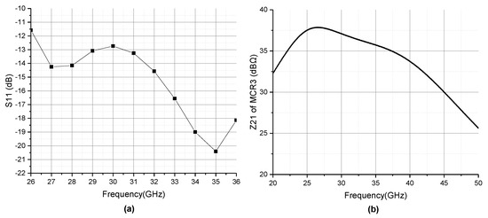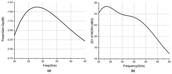 in which represents the power delivered to the load, and represents the power fed into the network. This factor takes into account the situation that the load impedance is not always matching [27]. The minimum loss is −1.376 dB at 28.1 GHz. In general, from 25 GHz to 40 GHz, the loss at high frequency is larger than that at low frequency. Figure 7b presents the trans-impedance (Z21) of the MCR4 with Z21 being defined as [28]: