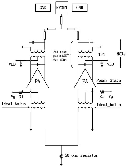 in which , , and are defined in Figure 2. Compared with an ideal lossless symmetrical MCR, the finite Q parameter of the lossy transformer makes the two amplitude peaks of Z21 not equal anymore [29]. Also, the practical coupling factor k of a lossy transformer is not a constant value compared with an ideal transformer. The test schematic for the Z21 of MCR4 with a 50 resistor at the input is shown in Figure 8. Although the input-matching condition of the power stage affects the test results, the power stage has good isolation due to the neutralization capacitors. Therefore, directly connecting a 50 resistor at the power stage input does not have a significant impact on the test results of the Z21. Also, the test iteration for Z21 is needed when the matching passives are designed. As a result, the initial Z21 test result is used to provide an intuitive perception of the gain shape. With the matching network being placed in the circuit, the “in-situation” Z21 test method takes the circuit parasitics into account [20].
