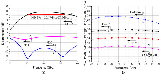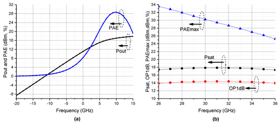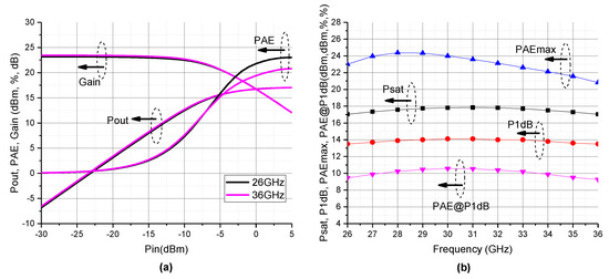 (a) Pout, PAE, and gain of the designed power amplifier at 26 GHz and 36 GHz, respectively and (b) the large-signal performance of the designed power amplifier from 26 GHz to 36 GHz.