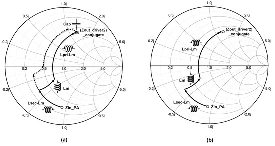 For the interstage matching network between the power stage and driver stage 2, the target is to achieve broadband matching between driver stage 2 output impedance and power stage input impedance. In transformer matching, we uses a simplified lumped T-model, shown in Figure 12, to estimate the size/parameters of the transformers [30]. For a transformer-based MCR, both the bandwidth and in-band ripple increase with higher coupling factor k, which has been investigated previously in references [16,31,32,33]. Meanwhile, the higher k results in lower insertion loss of the transformer. Considering that the TF1 and TF2 in MCR1 and MCR2 (shown in Figure 1) are used to adjust the small-signal bandwidth performance of the power amplifier, a higher k is preferred for TF3 (transformer 3 in MCR3 shown in Figure 1) regardless of the higher in-band ripple. Usually, the gate impedance has a higher Q factor than the output impedance of the transistor, and the higher Q results in increased gain ripple [16]. Adding paralleled resistors at the gate is an alternative way to reduce the Q factor and to extend the bandwidth [16,34]. Two 150 resistors (Rg at the power stage) are added at the gate of the power stage. Then, the input impedance of the power stage after adding resistors at the gate is ZM1 = 16 − j*43.6. The output impedance of driver stage 2 is ZM2 = 33.56 − j*62.78. The equivalent T matching of TF3 and the specific structure of MCR3 are shown in Figure 13a,b, respectively. In the MCR3, the output impedance of diver stage 2 (ZM2) is equivalent to a paralleled tank including a resistor and a capacitor . The input impedance of the power stage (ZM1) is equivalent to a paralleled tank including a resistor and a capacitor . The ZM2 is affected by the input-matching condition of driver stage 2 due to the non-zero S12 of the transistors. Considering that the neutralization technique is used for all three stages to cancel out the effect of Cgd of the transistors, the S12 for all three stages is small enough so that the ZM2 of driver stage 2 is not severely affected by the previous matching condition. Also, simulation iterations can be set to reset the value of ZM2. The TF3 is used to match ZM1 and ZM2. According to reference [35], when the two resonators of an MCR satisfy the condition of = , the peak Z21 of an asymmetrical MCR is almost the same as that of a symmetrical MCR, and the mismatch of and will deteriorate the insertion loss, especially at a higher frequency. In MCR3, = 1.87 and = 2.725 are obtained at 35 GHz. With a lower and = , the MCR3 achieve a better flat response and the mismatch of and could be accepted [35]. With the help of TF3, the matching between ZM1 and ZM2 has lots of matching trajectories, only including the T-model or T-model with extra capacitors, as shown in Figure 14a. Considering that the gain and output power of the transistors decrease as the operating frequency increases, the matching trajectory of TF3 is designed to achieve a good match at 35 GHz, and also = is set at 35 GHz, as shown in Figure 14b. Thus, a good match between ZM1 and ZM2 at 35 GHz and = for a better flat response are both satisfied for MCR3. Figure 15 presents the 3D view of the practical designed TF3. For the finally realized TF3, L1 is 561.46 pH and L2 is 348.62 pH with k being 0.525 at 35 GHz. Figure 16a presents the matching situation between power stage input impedance (ZM1) and (shown in Figure 13b) from 26 GHz to 36 GHz. A good match (S11 below −11 dB) between ZM1 and is achieved from 26 GHz to 36 GHz. Figure 16b shows the Z21 of MCR3 (TF3 is included) with the similar test method of MCR4 mentioned above. In Figure 16b, the Z21 magnitude at low frequency (25–30 GHz) is higher than that at higher frequency (35–40 GHz).