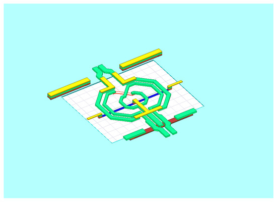 For the interstage matching network between driver stage 1 and driver stage 2, which is part of MCR2, it aims to achieve a high-pass form Z21 to compensate for the gain drop in MCR3 and MCR4 at high frequency. To achieve the high-pass form Z21, 33 GHz is selected as the initial matching frequency point between the input impedance of driver stage 2 (Zin-diver2) and the output impedance of driver stage 1 (Zout-driver1). At 33 GHz, Zin-driver2 = 30.62 − j*72.94 and Zout-driver1 = 50.48 − j*130.14, which is equivalent to parallel R and C of (204.37 ||56.21 fF) and (385.99 ||32.21 fF), respectively, as shown in Figure 17. Actually, there are lots of alternative transformers with different parameter combinations to match Zin-driver2 and Zout-driver1 at 33 GHz. The frequency points of the two peaks of Z21 for an MCR are affected by , , and the coupling coefficient k [36]. Thus, the peak Z21 positions for MCR2 is adjusted by tuning these parameters. Figure 18 presents a group of Z21 lines with different , , and k. In all four cases, Zin-driver2 and Zout-driver1 are conjugate-matched at 33 GHz. In Figure 18, different parameter combinations of the transformers have different peak Z21 positions and different in-band ripples, resulting in different Z21 gain shapes with matching networks inserted in the amplifier. A combination of = 585 pH, = 320 pH, and k = 0.462 (red line in Figure 18) is selected for TF2 to achieve the high-pass Z21 shape of MCR2. The two Z21 peaks are located at 32.5 GHz and 47.5 GHz, respectively, as shown in Figure 18. Figure 19a presents the 3D view of transformer 2 (TF2) in MCR2. Figure 19b shows the Z21 of MCR2 with a similar test method to those of MCR3 and MCR4, as mentioned above, by using the EM simulation result of TF2. Like the cases in MCR4 and MCR3, a finite Q of the inductors makes the Z21 line of MCR2 different from that using an ideal transformer (red line in Figure 18). However, the average magnitude of the Z21 from 32.5 GHz to 40 GHz is relatively higher than that from 25 GHz to 32.5 GHz. Therefore, it indicates that a high-pass form Z21 is achieved.
