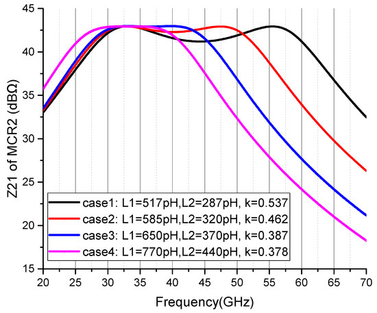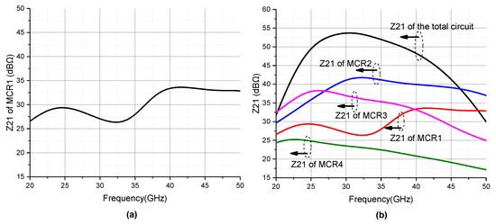 Figure 22a presents the Z21 of MCR1 with the whole input-matching network shown in Figure 20b. Compared with the initial desire with the condition of = , the two Z21 peaks are not equal anymore. The loss of the transformer affects the Z21 response [29]. Meanwhile, the equivalent , , , , and k being non-constant with frequency also affects the Z21 response. In Figure 22a, the Z21 magnitude of MCR1 at the frequency edge (from 25 GHz to 40 GHz) is much higher than that at the frequency center (from 30 GHz to 35 GHz). Therefore, the Z21 drop at the band edge is compensated, like the case in reference [7]. Figure 22b presents the Z21 of each MCR and the Z21 of the total circuit. It indicates that the Z21 amplitudes of the first and second MCRs compensate for that of the third and the fourth. Therefore, a wideband total Z21 of the whole circuit from input to output is achieved.