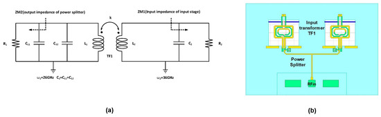 (a) The lumped model of MCR1 based on TF1 for matching and (b) the 3D view of the input-matching network including TF1 and the power splitter.