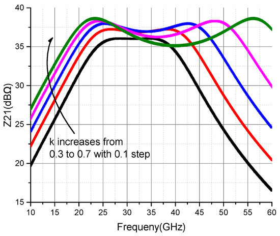 For the input-matching network, an asymmetrical MCR1 satisfying = and resulting in two equal Z21 peaks, is used to extend the bandwidth [16]. Figure 20a presents the lumped model of MCR1 based on TF1 for matching. The input impedance of the input stage (ZM1 = 42.94 − j*119 at 36 GHz) is equivalent to a paralleled tank including a resistor and a capacitor . The output impedance of the power splitter (ZM2 = 82.16 − j*22.12 at 26 GHz) is equivalent to a paralleled tank including a resistor and a capacitor . The power splitter is designed by using microstrip transmission-line segments to reactively match the impedance and split the input power to the two-way driver stage 1 in-phase, as shown in Figure 20b. on the left side is the extra added capacitor to satisfy the condition of = for the asymmetrical MCR1. In MCR1, we set = 26 GHz, = 36 GHz. For the input stage, as shown in Figure 1, a pair of paralleled Rg of 500 , and a pair of series Rs of 10 are added at the gate of the input transistors. All these resistors decrease the Q factor of the input impedance of the transistors. Also, Rs improves the common mode stability of the circuit. After adding these resistors, the input impedance of the input stage ZM1 is 42.94 − j*119 at 36 GHz. Its equivalent paralleled resistance and capacitance are = 372.7 and = 32.87 fF, respectively. As resonates with at 36 GHz, we obtain = = 594.6 pH and = * = 2.771. Based on = , we obtain = 2 and = 139 fF. As resonates with at 26 GHz, we acquire = = 269.5 pH. As mentioned above, is the equivalent output paralleled capacitor of the power splitter, which is 18.7 fF at 26 GHz in this work; thus, the added extra capacitor is 120.33 fF (equals to ()). So far, the coupling factor k between and has not been determined. Usually, a higher k makes the two Z21 magnitude peaks of an MCR be apart from each other [16,31,32,33]. Figure 21 shows the Z21 of the MCR1 with a k increasing from 0.3 to 0.7, when the inductors and capacitors are all ideal components. With an increasing k, both the bandwidth and in-band ripple are increased. Considering the target frequency, in-band ripple, and the difficulties of an actual transformer implementation, a k of 0.573 at 32 GHz is selected and achieved for this MCR1. The 3D view of the input transformer (TF1) is shown in Figure 20b. The primary inductance () at 26 GHz is 266.65 pH, and the secondary inductance () is 596.4 pH at 36 GHz for the finally achieved practical transformer.