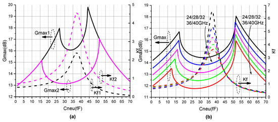 Figure 1 shows the architecture of the implemented wideband power amplifier. Three common-source stages are used to improve power gain and to stagger the Z21 of each MCR stage conveniently. Output power is increased by two-way current-combining. The matching networks mainly consist of transformer-based MCRs between each stage and transmission lines for the input and output. The gate biases of the transistors are supplied through the center tap of the transformers (TF1, TF2, and TF3) by series resistors (R1) of 250 to improve common mode stability [37]. Especially for the input stage, series resistors Rs of 10 are inserted between gate and the input transformer (TF1) to further suppress the common-mode oscillation. Pseudo-differential NMOS pair with neutralization capacitors has been employed to all the stages. The neutralization capacitors implemented via metal–oxide–metal are used to tackle the negative feedback and to improve reverse isolation [37]. Then, both the power gain and stability are improved. Shunt resistors are added at the gate of each stage to reduce the Q factor of the impedance, to help implement matching, and also to improve the stability of the circuit. Figure 23a presents the Gmax and stability of the 128 m transistor used in the output differential pair versus the values of neutralization capacitance (Cneu) at 32 GHz. Gmax1 and Kf1 present the condition without gate paralleled resistors, and Gmax2 and Kf2 present the condition that two 150 gate paralleled resistors (Rg for output stage) are added. It indicates that the Cneu range sustaining Kf > 1 is extended from about 23.9% to 51.7%. Also, the Gmax decreases by about 3 dB when Cneu is 37 fF. Considering that the whole circuit is composed of three cascaded circuit stages, the gain reduction induced by these shunt resistors at each stage is acceptable. Figure 23b shows the Gmax and Kf at different frequencies with shunt resistors added. It demonstrates that the Cneu ranges sustaining Kf > 1 at different frequencies are almost the same. Even at 40 GHz, the Gmax is bigger than 11.75 dB. The neutralization capacitance (Cneu) selected for the three stages are 37 fF/17 fF/9.5 fF, respectively. All the neutralization capacitors are implemented with parallel-plate metals. In this work, 2*32/1*32/1*16 fingers with a finger width of 2 µm (128 m*2 for the output stage differential pair) for the output stage, driver stage 2, and driver stage 1 are used for better performance. The metal lines on transistors are simulated using a 3D EM simulator. The 1.1 V VDD supply is fed through the center tap of the transformers. The 0.6 V VGS for the power stage and driver stage 2 and 0.55 V for driver stage 1 are selected for the consideration of output power and PAE.