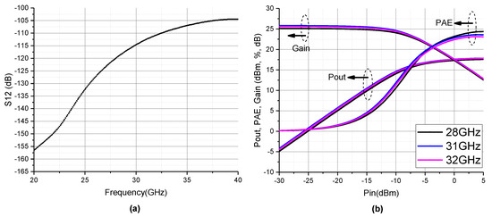 (a) The simulated S12 of the designed power amplifier and (b) Pout, PAE, and gain of the designed power amplifier at 28GHz, 31GHz, and 32GHz, respectively.