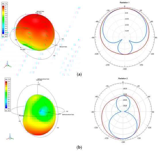 Tag antenna 1D/3D radiation direction chart. (a) Anti−metal tag antenna 1D/3D radiation direction diagram, (b) traditional non−anti−metal tag antenna 1D/3D radiation direction diagram. The red line is gain curve when phi is 90°, and blue line is gain curve when phi is 0°.