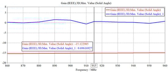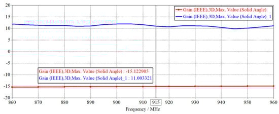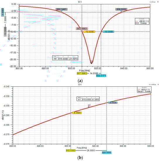 Figure 5a,b represent the designed anti-metal tag antenna S11 parameter curve and the traditional non-metal tag antenna S11 parameter curve, respectively. From Figure 5a, it can be seen that the minimum value of anti-metal tag antenna S11 parameters is about −21.6 dB, which is located at the center frequency point of 915 MHz, and the −10 dB bandwidth is about 907.9 MHz~922.5 MHz, which meets the performance requirements. In addition, its radiation main flap bandwidth (−3 dB) range is about 892.3 MHz~938 MHz, with a width of about 46 MHz, which fully meets the band range of 902 MHz ~928 MHz commonly used in EPC Gen2 standard, and the tag performance is quite excellent under the international standard. As can be seen from Figure 5b, the traditional non-metal resistant tag antenna S11 parameters gradually increase between 902 MHz~960 MHz, and the −10 dB bandwidth and radiation main flap bandwidth do not meet the performance requirements.