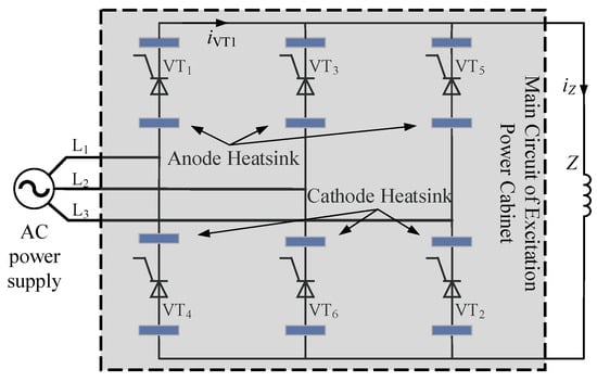 Nowadays, the development of power electronics technology and its manufacturing process has made great progress, and the high-power rectifier power supply composed of independent thyristor components has been widely used. The rectifier power supply adopts the ring heat pipe cooling technology, and its cooling method adopts an aluminum heatsink for forced air-cooled cooling, which can realize complete self-cooling operation. The main circuit of the high-power rectifier is shown in Figure 7, which consists of six sets of independent thyristor components and forms a three-phase bridge-type fully controlled rectifier circuit with the three-phase AC inlet and DC outlet lines.