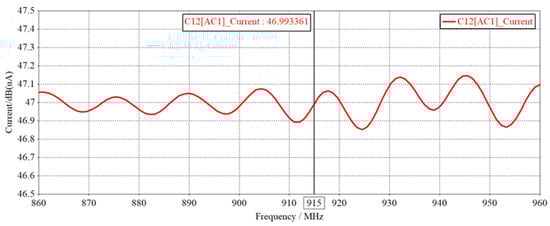 Through the simulation model of the main circuit of the excitation power cabinet in the previous subsection, the conduction current curves shown in Figure 11 are obtained for the cathode heatsink of thyristor VT1 and the parasitic capacitor C12, and the conduction currents range from 46.8 dB to 47.1 dB in the frequency band of 860 MHz~960 MHz, and the current size at 915 MHz is about 47 dB, indicating that the excitation power cabinet during the operation of the heatsink in the 860 MHz~960 MHz band has high-frequency common mode conduction current generation, common mode current size has exceeded GB 9254-2008, GB/T 29768-2013, GB/T 17618-1998 and other national standards and AIMC 0002-2006 China Automatic Identification Technology Association RFID anti-metal tag immunity range in the standard, there is conducted interference generation, and the parasitic capacitance of the heatsink provides a pathway for common mode conduction current.