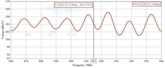 Figure 12 shows that the conduction voltage curve generated on the heatsink when the conduction current flows through the thyristor VT1 cathode heatsink is obtained through simulation, and the magnitude of the voltage to ground is between 101 dB and 107 dB in the 860 MHz~960 MHz band, and the magnitude of the voltage at 915 MHz frequency is 104 dB, indicating that the excitation power cabinet during the operation of the heatsink in 860 MHz~960 MHz frequency band has high-frequency voltage generation, common mode conducted voltage size has exceeded GB 9254-2008, GB/T 29768-2013, GB/T 17618-1998 and other national standards and AIMC 0002-2006 China Association of Automatic Identification Technology standard of RFID anti-metal tag immunity range, there is conducted interference generation, and this high-frequency voltage is also an important reason for the generation of parasitic capacitance.