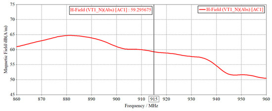 The magnetic field curves generated on the cathode heatsink of thyristor VT1 when the conduction current flows through the cathode heatsink are obtained by simulation as shown in Figure 14. The magnetic field strength of the thyristor VT1 cathode heatsink ranges from 50.5 dB to 64.7 dB in the 860 MHz~960 MHz band, and the magnetic field strength is about 59.3 dB at the 915 MHz frequency, indicating that the excitation power cabinet during the operation of the heatsink generates a considerable magnetic field in the 860 MHz~960 MHz band, which can produce magnetic field interference to the objects on the heatsink.