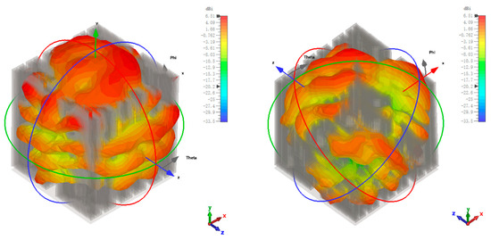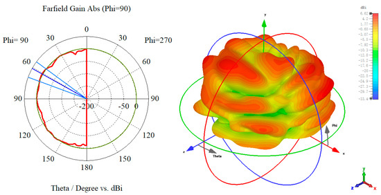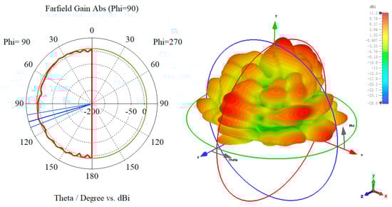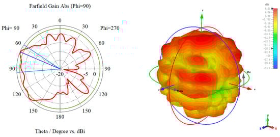Figure 4a,b indicates the 1D/3D radiation direction diagram of the designed anti-metal tag antenna and the 1D/3D radiation direction diagram of the traditional non-metal tag antenna, respectively. As can be seen in Figure 4a, the anti-metal tag antenna in the metal conductor plane has a high peak gain; and the antenna radiation direction are facing the metal plane above, in the metal plane above with better omnidirectional and larger gain, to meet the antenna omnidirectional requirements, can make the reader in all directions to read and write to the tag. In Figure 4b, the traditional, nonresistant-to-metal tag antenna is affected by the metal plane, and the gain is seriously reduced because the metal influence makes its radiation direction located below the tag; overall, the performance declines significantly.