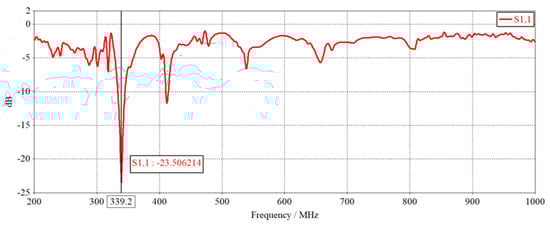 Figure 18 shows the radiator radiation S11 parameter curve, the curve is in the 200 MHz~1000 MHz band to do the full-band simulation. From the figure, it can be seen that the resonance point of the radiator radiation in 339.2 MHz, S11 < −10 dB frequency band concentrated in 333 MHz~345 MHz and 410 MHz~414 MHz range, in the 860 MHz~960 MHz band S11 parameter values in −5 dB~0 dB, indicating that the radiator as a radiation body, in the 860 MHz~960 MHz band on the RFID temperature measurement tag radiation interference degree is small.
