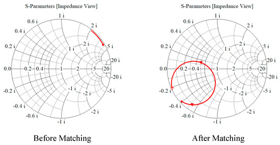 RFID temperature measurement tag in the CST software for simulation, the tag antenna port impedance matching is required. As shown in Figure 19, after matching the antenna impedance with the port impedance by the Smith circle diagram, the matched capacitance topology between the antenna and the port can be obtained, as shown in Figure 20, where Ca = 12.3 pF and Cb = 1.8 pF.