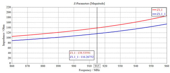 Figure 28 shows the antenna by radiation interference, the antenna impedance curve comparison, the red curve for the antenna under normal conditions, and the blue curve for the antenna by radiation interference impedance curve. From the figure, it can be seen that the antenna by radiation interference is in the 860 MHz~960 MHz band; the antenna impedance overall downward shift, in the center frequency point antenna impedance from the original 138.5 Ω reduced to 116.3 Ω, the change amplitude of about 19.1%, indicating that the antenna in the radiator radiation interference, impedance change, and the antenna impedance matching also changed; the antenna’s performance will be affected.