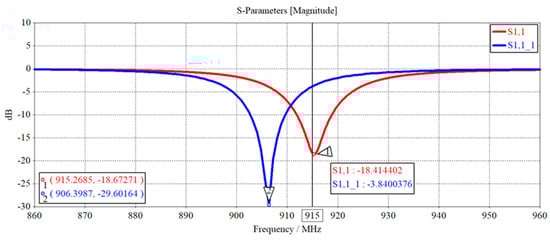 Figure 29 shows the S11 parameter curve comparison of the antenna by conducted interference. The red curve is the S11 parameter curve of the antenna under normal conditions, and the blue curve is the S11 parameter curve of the antenna after radiation interference. It can be seen from the figure that the center frequency point of the antenna is shifted after the interference, from 915 MHz to 906 MHz, and the S11 = −3.8 dB > −10 dB at 915 MHz frequency. The bandwidth of S11 < −10 dB is also slightly narrowed, but the bandwidth of S11 < −10 dB also has a slight narrowing, but the band still all fall in the most common band of EPC Gen2 standard 902 MHz~928 MHz, indicating that the antenna is affected by the radiation interference from the radiator, but the radiation interference has a small impact on the antenna, and the working performance of the antenna is limited.
