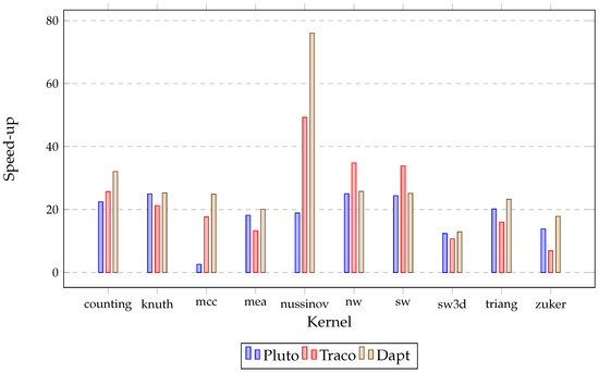Numerous manual and semi-automatic strategies are available in papers [2,3,30,31,32,33,34] to improve the locality of the NPDP tasks. However, they are limited to the serial code, limited to only one considered NPDP problem, or no-implemented and maintained. Hence, we focused on the well-documented automatic, source-to-source optimizers that realize multi-threading using OpenMP [35].