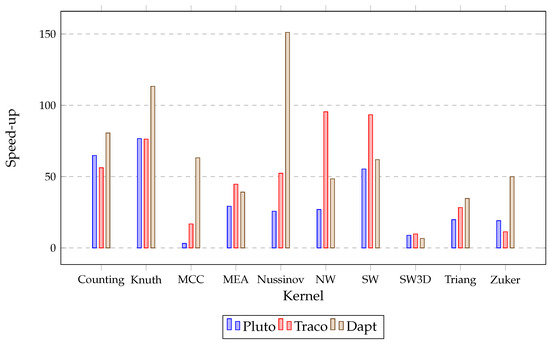 Indeed, DAPT has succeeded in normalizing non-uniform dependencies to uniform ones. Unlike Pluto, which only generates code that supports two-dimensional tiling, DAPT and Traco are capable of generating codes that cater to three-dimensional tiling as well nussinov, nw, sw benchmarks. This illustrates the importance and advantage of DAPT’s uniformization process.