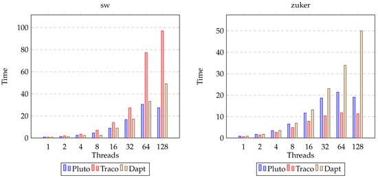 We analyzed the AMD EPYC 7H12 scalability due to the number of threads for the four chosen benchmarks (depicted in Figure 3). The DAPT codes are scalable; however, for the sw kernel, better results are achieved with the Traco compiler. A growing number of threads does not reduce the time for the TRACO codes of the Nussinov and Zuker benchmarks. This is caused by the irregular shapes of tiles. The times for the Pluto code executions are inferior to the rest of the results, particularly for 2d-tiled nussinov [41].