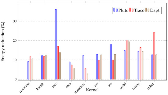 Remarkable DAPT results are evident for the Nussinov kernel, which reduces the RAM memory calls to 7.22% compared to the Traco compiler’s 19.98% and the Pluto optimizer’s 54.43%. It also increases the number of instructions per cycle to 0.57 in contrast to Traco’s 0.19 and Pluto’s 0.05. In a manner similar to the AMD 7542, the Traco compiler enables us to achieve the best execution times for the benchmark suite, with the exception of the nw and sw kernels. These kernels are well-optimized through the tile correction strategy. Figure 4 illustrates energy reduction in percentages, represented as the ratio of energy consumed by the optimized code to the energy used by the original code.