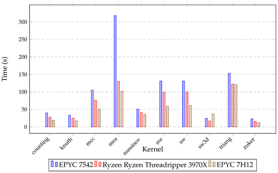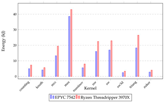 Table 6 details the characteristics of both the AMD EPYC and Ryzen Threadripper platforms. When comparing time results for kernels on each machine, the Ryzen Threadripper 3970X is observed to surpass the EPYC 7542 using the same number of threads (64). The most significant time reduction for kernels is achieved using the EPYC 7H12 with 128 threads, indicating the scalability of the generated codes, as shown in Figure 5. In a comparison of energy consumption for NPDP kernel execution, the Threadripper demands more watts during parallel code execution, as seen in Figure 6. This increased consumption can be attributed to the Threadripper’s superior base and turbo clock speeds.