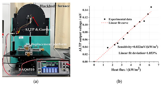 To ensure the same amount of thermal radiation was received by Gardon and ALTP, blackbody paint with an absorption rate of 0.95 was sprayed on the surface of both the Gardon gauge and ALTP. Compared with laser thermal radiation, blackbody thermal radiation can avoid the spectral dependence of a single wavelength on the surface of the sensitive element and is closer to the thermal radiation generated by the high-temperature fireball in the explosion field. The calibration system and the linear fitting results of the sensitivity are shown in Figure 2.