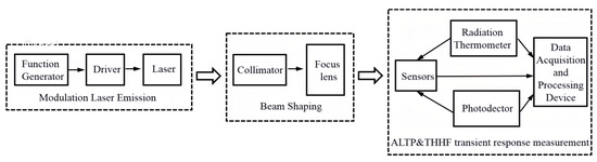 Given the research foundation, achieving an accurate transient radiant heat flux measurement at the moment of detonation with ALTP requires high temporal resolution. This section utilizes a semiconductor laser to initially gauge ALTP response time. This method is preferred over using blackbody furnaces, graphite plates, or halogen lamps, as the high-frequency response characteristic of the heat flux sensor can be assessed via a narrow-pulse laser. The laser’s parameters include a maximum power of 6000 W, a minimum pulse width of 10 μs, and a wavelength of 915 nm in the infrared region under monopulse emission mode. The test system comprises a semiconductor laser, function generator, collimator, focusing lens set, high-speed infrared radiation thermometer, a THORLABS DET10A/M silicon photodetector (rise time 1 ns, wavelength range: 200 nm–1100 nm), and a data acquisition system incorporating an anti-aliasing signal amplifier. The function generator modulates the laser’s output signal for different pulse widths, and the beam-shaping component is tasked with collimating and focusing the laser with a divergence angle. The photodetector monitors the laser’s output signal, while the radiation thermometer continuously measures ALTP’s surface temperature to avoid exceeding the rated temperature during calibration. Figure 3 delineates the principle of the test system.