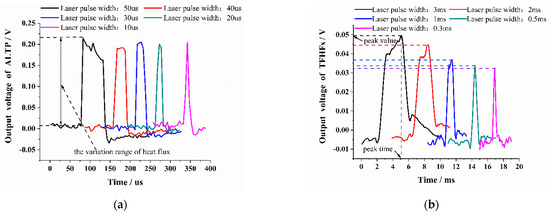 The laser was configured at a power of 3000 W, and pulse widths were set at 50 μs, 40 μs, 30 μs, 20 μs, and 10 μs, respectively. Figure 4a displays the corresponding test curve derived from the data acquisition system. The amplitude of the ALTP impulse response is observed to remain stable at 0.22 V. Experimental results affirm that the amplitude of the ALTP’s impulse response stays virtually undistorted, reflecting excellent dynamic performance even as the laser pulse width decreases. Under the current experimental conditions, the fastest response time of the ALTP is 10 μs. According to reference [7], the rise time of a high-brightness fireball’s thermal radiation at the moment of initiation is approximately 40 μs, allowing the ALTP to theoretically detect the radiant heat flux in an explosion field. Figure 4b illustrates the TFHF’s experimental results under varied laser pulse durations (0.3 ms to 3 ms) [17]. A reduction in pulse width results in the TFHF’s potential output value decreasing from 0.05 V to 0.032 V, with a pronounced attenuation of amplitude. Utilizing the same laser power, the TFHF can only respond to millisecond laser pulses, and the sensor’s output signal amplitude diminishes progressively to the sub-millisecond range, leading to increased distortion. Consequently, it can be inferred that the ALTP’s temporal resolution is markedly superior.