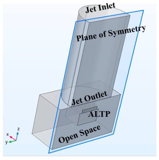 As depicted in Figure 5, the ALTP sample was positioned in an open space at a specific distance from the jet outlet. To reduce computational load, the geometric model was simplified using the plane of symmetry, resulting in 27,117 mesh cells with a total degree of freedom of 434,876. The k-ω model, founded on the Reynolds average method (RANS), was applied to analyze turbulent kinetic energy and turbulent dissipation rate, incorporating wall functions near the wall. Due to the strong nonlinearity induced by turbulence in ALTP geometry, efforts were made to avoid large aspect ratios, leading to the establishment of a non-scaled-up model. This choice, however, did not affect the qualitative analysis of ALTP. The thicknesses of the sensitive layer YBCO and substrate material LaAlO3 are 20 μm and 0.1 mm, respectively, with the ALTP’s distance from the jet outlet set at 0.3 mm [20,21].