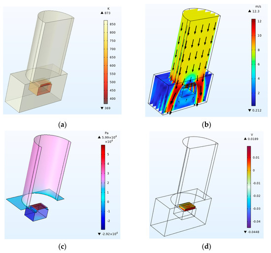 Figure 6. (a) 3D temperature distribution; (b) 3D velocity distribution; (c) 3D pressure distribution; (d) 3D electric potential distribution.