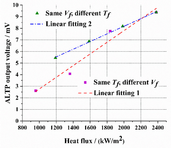 After conducting linear fitting, it was observed that the ALTP’s linearity is satisfactory when the fluid velocity ( V f ) is constant and the fluid temperature ( T f ) is variable. Conversely, when Tf is constant and V f varies, the ALTP’s linearity is suboptimal. Furthermore, the heightened calculated sensitivity indicates that V f variations interfere with the sensor’s linearity. As illustrated in Figure 7, V f discrepancies modify the ALTP’s sensitivity under convective heat transfer, leading to measurement errors. By evaluating linear fittings 1 and 2, it becomes apparent that the sensitivity error caused by velocity variation is as much as 71%, a significant figure that cannot be overlooked. Reference [10] determined the sensor sensitivity’s confidence interval, through a convection calibration experiment, to be S c o n v = 1.3 + 0.5 μVm2/kW, exhibiting considerable fluctuation. Furthermore, the findings of reference [11] emphasized that sensitivity transfer between radiation-calibrated sensors in convective settings may lead to severe systematic errors, underscoring the feasibility of the multi-physics simulation model devised in this work.