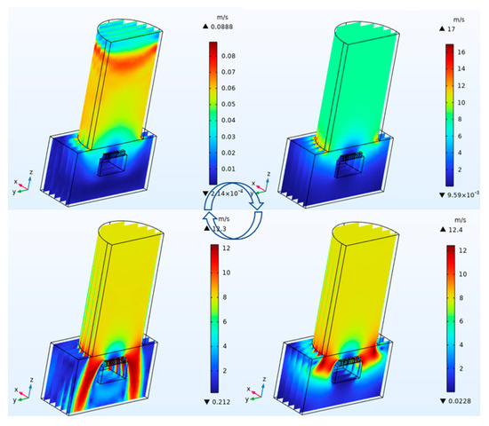 It can be seen that only the transient term on the left side of the formula is added. As for the boundary condition equation, it is similar to the static model in Section 5.2, so it will not be repeated. Figure 8 depicts the model’s velocity distribution at different times. The ALTP’s positioning in open space at room temperature is notably distinct from the thermal convection phenomenon in the wind tunnel and is more representative of the sensor being exposed to high-temperature air resulting from an outdoor explosion field.