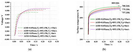 Figure 9. (a) Dynamic response at different Vf; (b) surface temperature at different Vf.