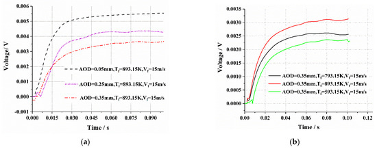 Figure 10a illustrates the response curves of ALTP at varying distances between ALTP and the jet outlet (AOD), as derived from simulations 4 to 6. The results demonstrate that an increase in AOD leads to a decrease in the steady-state value reached by the sensor, though the impact on ALTP’s time constant is minimal. Moreover, the thermoelectric potential output exhibits substantial fluctuations when the sensor is farther from the jet outlet. It is inferred that the influence of the fluid diminishes, and the interference from open space amplifies. As presented in Figure 10b, an increase in fluid temperature augments ALTP’s steady-state value but leaves the time constant unaffected.
